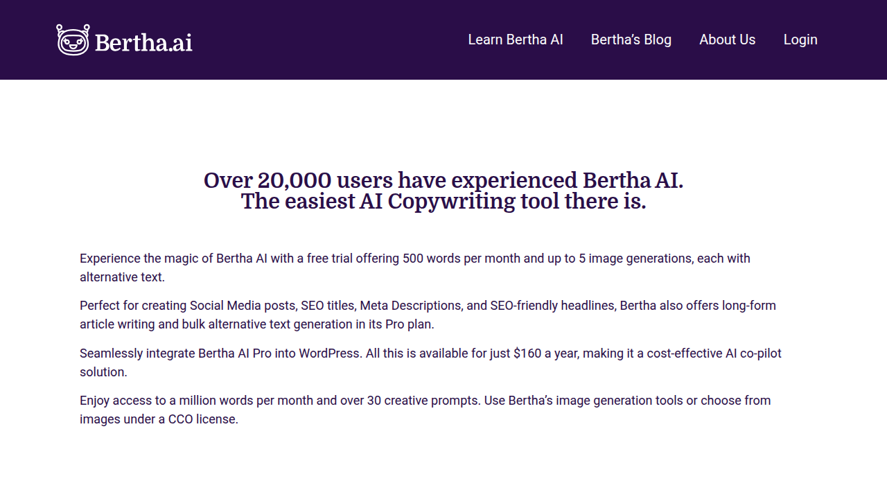 Bertha.ai — это инструмент на базе искусственного интеллекта, который создает контент веб-сайта быстрее, чем ручные методы, предлагая модули чата и GPT, поиск изображений, а также поддержку нескольких языков и конструкторов страниц.