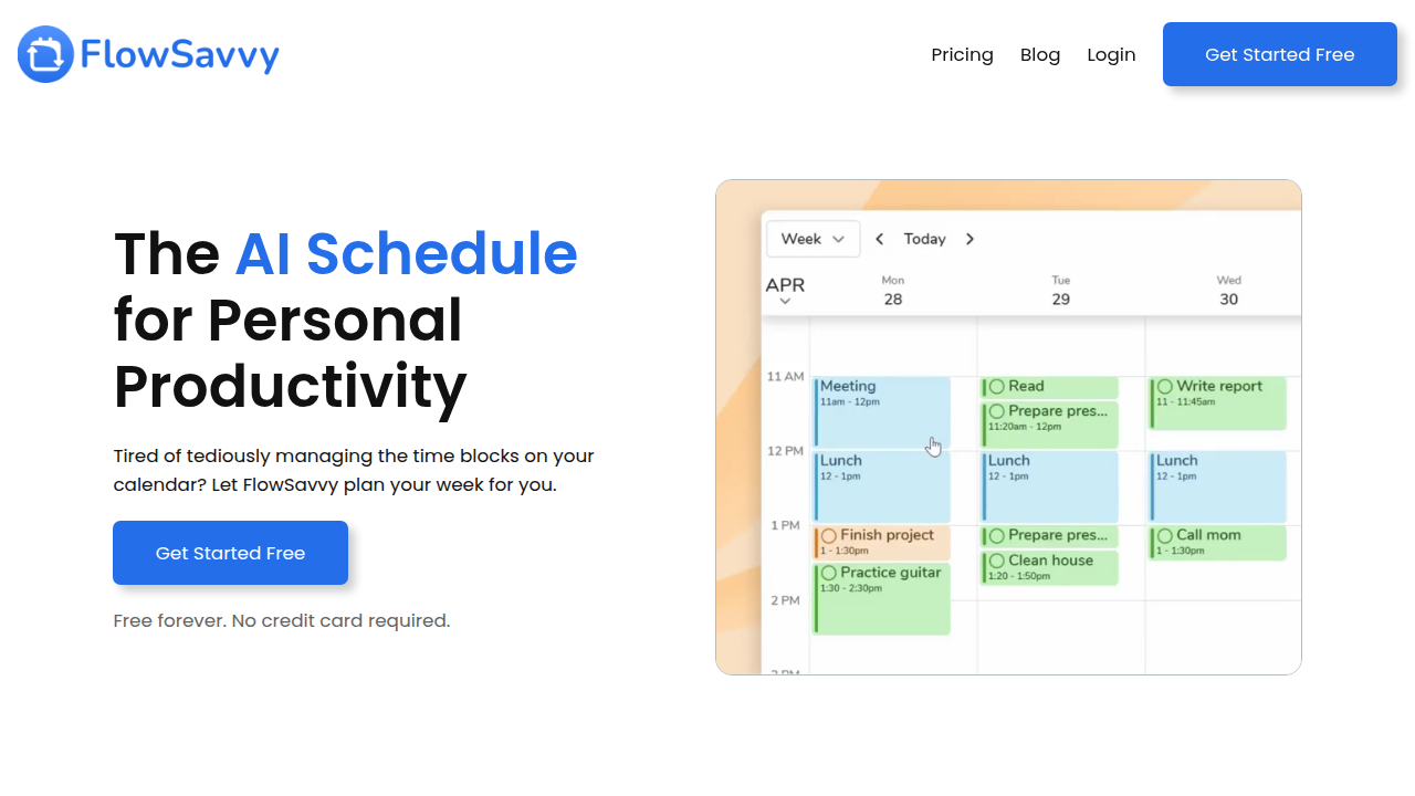 FlowSavvy автоматизирует блокировку времени для эффективного еженедельного планирования и помогает управлять временем. Он предлагает интеллектуальное планирование, задачи с цветовой кодировкой и плавную синхронизацию между платформами Интернета, iOS и Android, чтобы упростить управление задачами и повысить производительность.