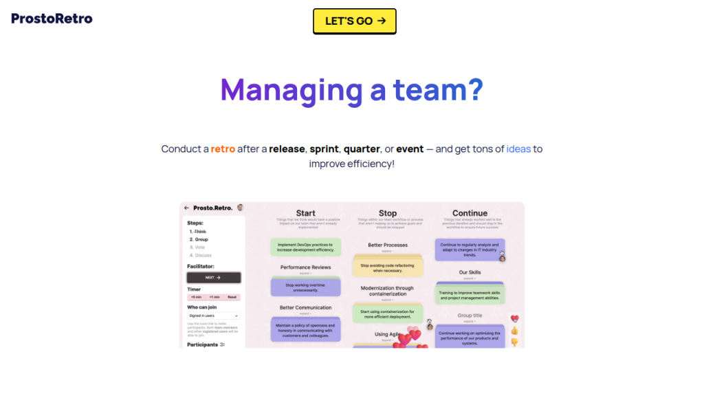 Prostoretro — это бесплатный онлайн-инструмент для ретроспективы для agile-команд, предлагающий анонимность участников и различные шаблоны. Эффективно проводите ретроспективы с помощью быстрых опросов, опросов для оценки настроения команды и группировки схожих мыслей с помощью ИИ.