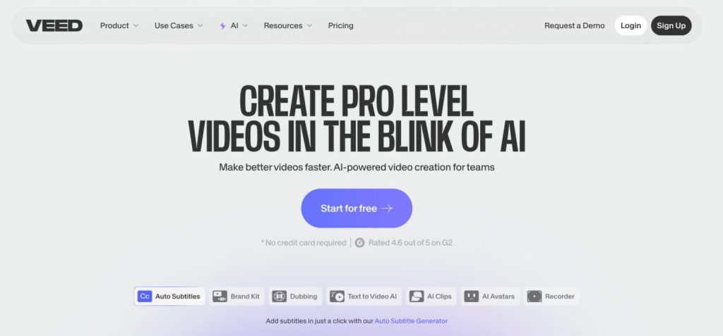 Veed.io — это универсальный инструмент для редактирования видео с такими функциями, как видеоредактор, устройство записи экрана, устройство записи с веб-камеры и инструменты искусственного интеллекта для различных вариантов использования.