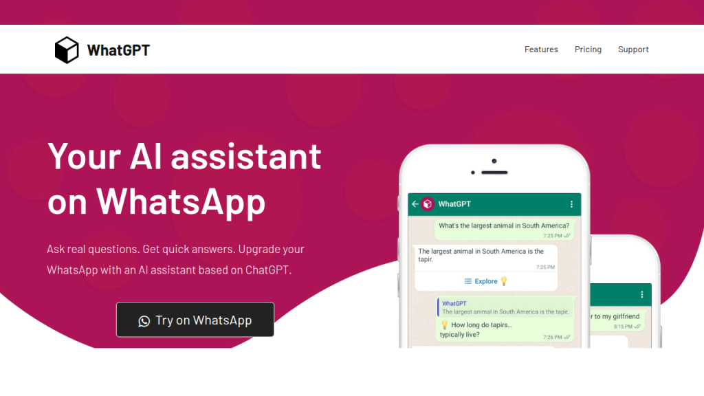 Whatgpt — это инструмент искусственного интеллекта, предназначенный для обновления WhatsApp с помощью функций чата на основе искусственного интеллекта и предложений быстрого ответа для разговоров в реальном времени. Он также предоставляет список веб-ссылок для дальнейших исследований и исследований.